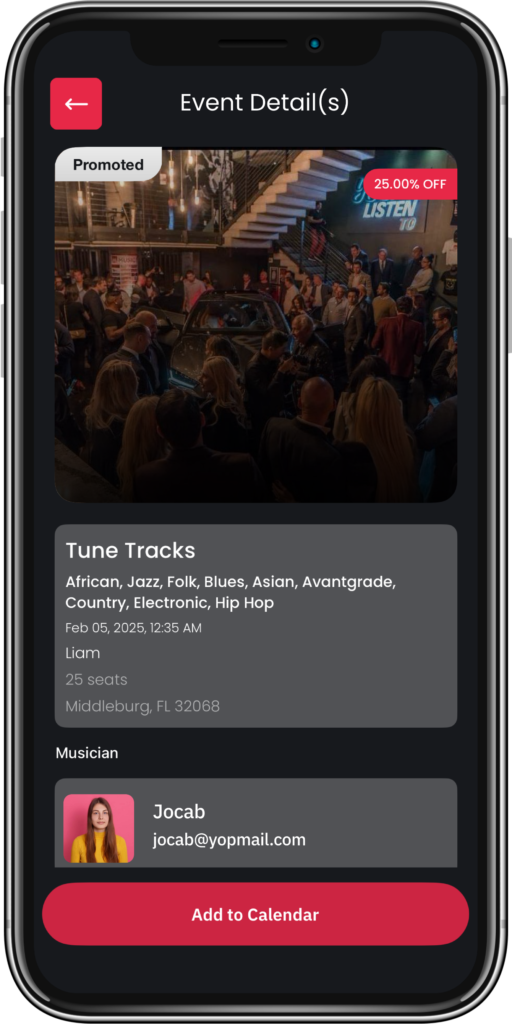 Share your venue’s name, location, live music preferences, and seating details. Include a live calendar with open dates and booking details to attract musicians who match your needs, streamlining the booking process.